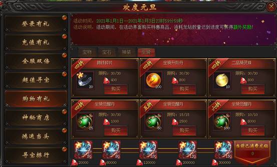 活动说明:活动期间,在活动界面购买特惠商品,消耗龙钻数量达到进度可获得额外奖励!