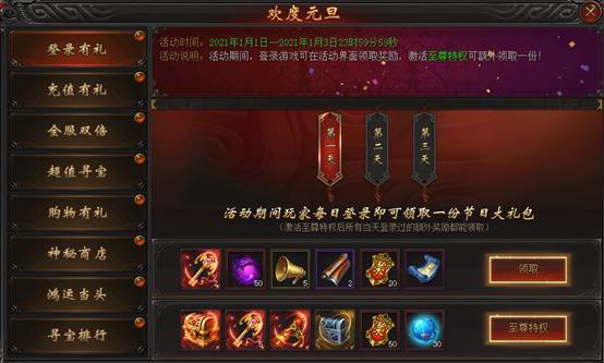 活动说明:活动期间,每日登录游戏可领取奖励,激活至尊特权可额外领取一份!