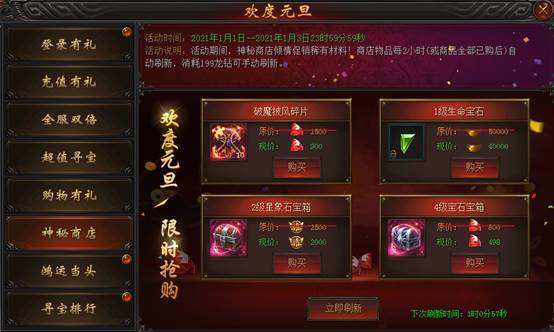 活动说明 : 活动期间,神秘商店倾情促销稀有材料!商店物品每2小时自动刷新(或全商品全部已购后),消耗199龙钻可手动刷新。