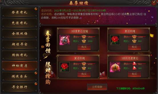 活动说明 : 活动期间,神秘商店倾情促销稀有材料!商店物品每2小时自动刷新(或全商品全部已购后),消耗199龙钻可手动刷新。