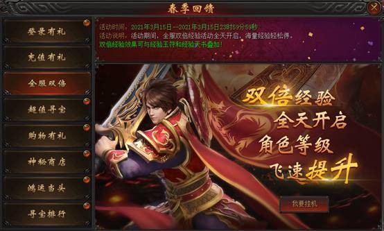 活动说明:活动期间,全服双倍经验活动全天开启,海量经验轻松得。双倍经验效果可与经验玉符和经验天书叠加!