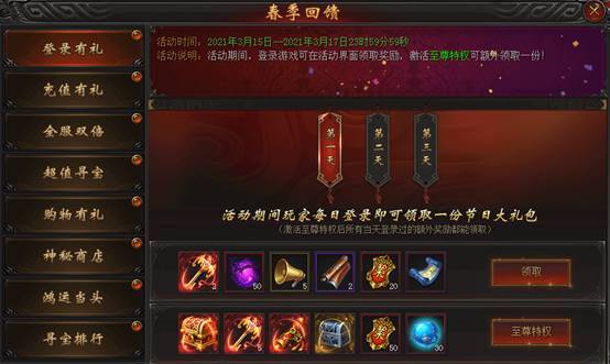 活动说明:活动期间,每日登录游戏可领取奖励,激活至尊特权可额外领取一份!
