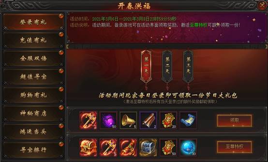 活动说明:活动期间,每日登录游戏可领取奖励,激活至尊特权可额外领取一份!