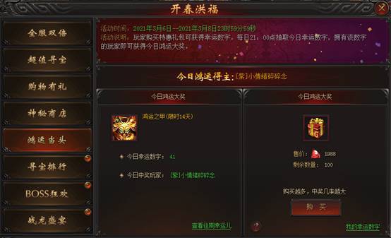 活动说明 : 玩家每消耗1988龙钻即可获得一个1-100之间的幸运数字。每日21点抽取今日幸运数字,拥有该数字的玩家即可获得今日鸿运大奖。