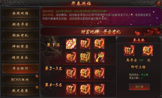 活动说明:活动期间,战龙秘宝寻宝500次即可获得参与奖,寻宝排名前五升级为超值排名奖励,活动结束后奖励将通过邮件发放。