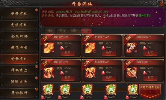 活动说明:活动期间,在活动界面购买特惠商品,消耗龙钻数量达到进度可获得额外奖励!