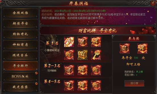 活动说明:活动期间,战龙秘宝寻宝500次即可获得参与奖,寻宝排名前五升级为超值排名奖励,活动结束后奖励将通过邮件发放。
