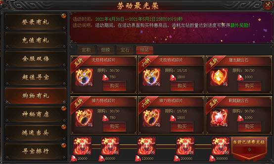 活动说明:活动期间,在活动界面购买特惠商品,消耗龙钻数量达到进度可获得额外奖励!