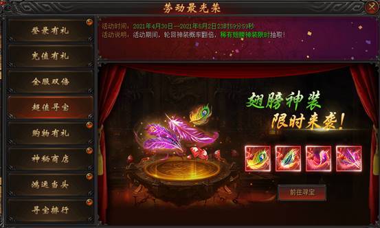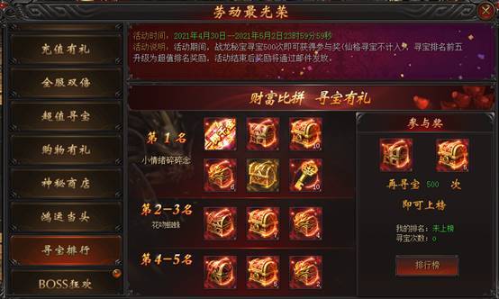 活动说明:活动期间,战龙秘宝寻宝500次即可获得参与奖,寻宝排名前五升级为超值排名奖励,活动结束后奖励将通过邮件发放。