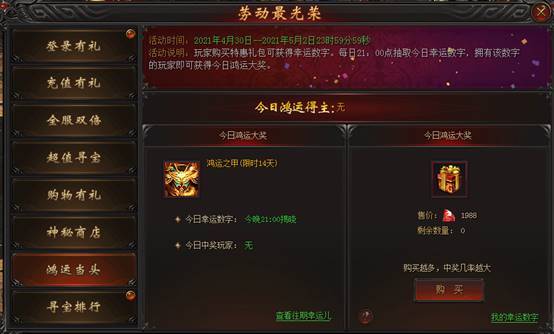 活动说明 : 玩家每消耗1988龙钻即可获得一个1-100之间的幸运数字。每日21点抽取今日幸运数字,拥有该数字的玩家即可获得今日鸿运大奖。
