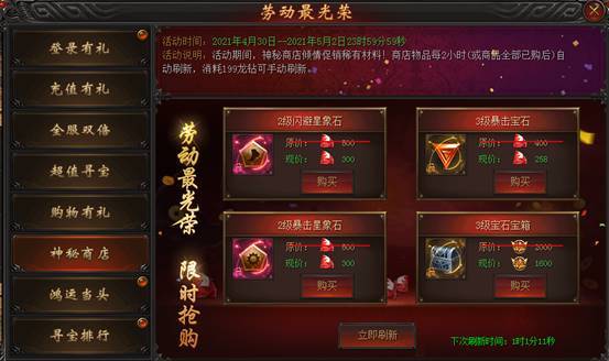 活动说明 : 活动期间,神秘商店倾情促销稀有材料!商店物品每2小时自动刷新(或全商品全部已购后),消耗199龙钻可手动刷新。