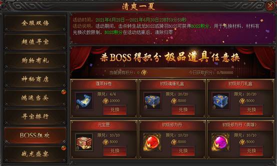 活动说明 : 活动期间内,击杀BOSS获得“boss积分”,“boss积分”可用于兑换材料,每种材料均有兑换次数限制,“boss积分”在活动结束后,清除归零