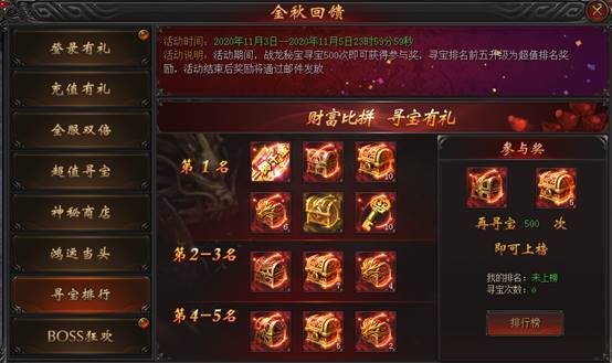 活动说明:活动期间,战龙秘宝寻宝500次即可获得参与奖,寻宝排名前五升级为超值排名奖励,活动结束后奖励将通过邮件发放。”