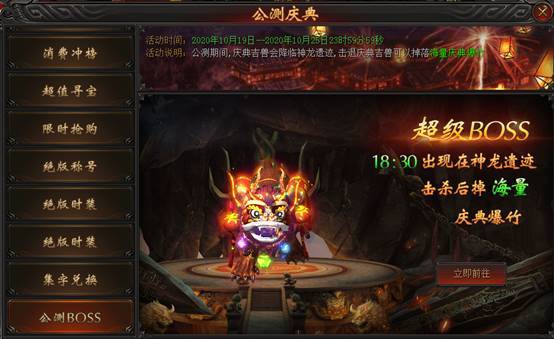 活动说明 : 公测期间,庆典吉兽会将临神龙遗迹,击败庆典吉兽会掉落海量庆典爆竹,使用可获得丰厚奖励。