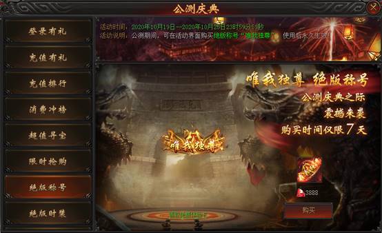 活动说明 : 公测期间,可在活动界面购买绝版称号“唯我独尊”,使用后永久生效。