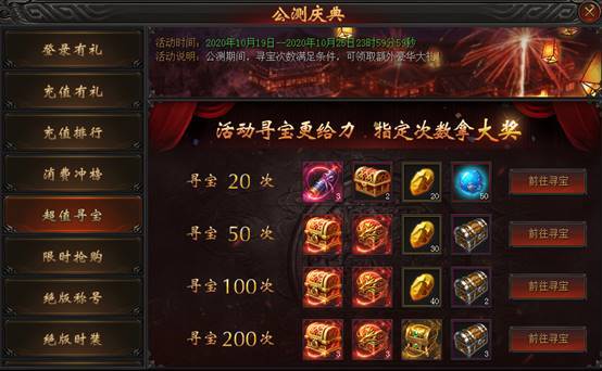 活动说明 : 公测期间,寻宝次数满足条件,即可领取额外豪华大礼!