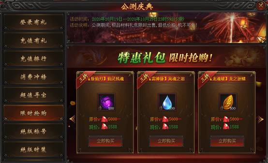 活动说明 : 公测期间,极品材料特价限时出售,超低价格,助你迅速提升实力!