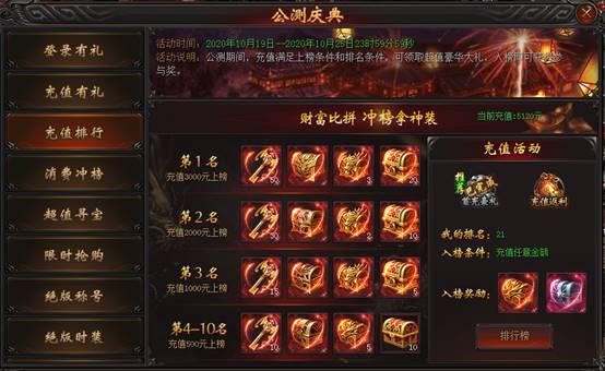 活动说明:公测期间,充值满足上榜条件和排名,可领取超值豪华大礼,充值任意金额即可入榜获得参与奖。