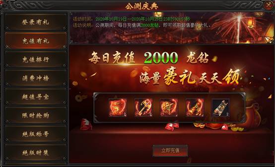 活动说明:活动期间,每日充值满2000龙钻!即可领取超值豪华大礼