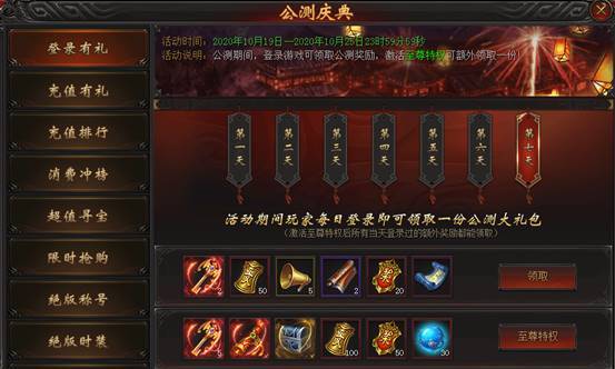活动说明:10月19日前开的服活动时间从10月19日开始持续7天,10月19日~10月25日开的服活动时间从开服第1天开始,持续7天