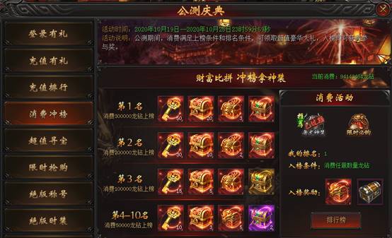 活动说明:公测期间,消费满足上榜条件和排名,可领取超值豪华大礼,消费任意数量龙钻即可入榜获得参与奖。