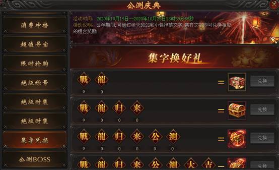 活动说明:公测期间,打怪会掉落“文字”,收集对应的文字组合即可领取奖励。奖励所有玩家均可领取。
