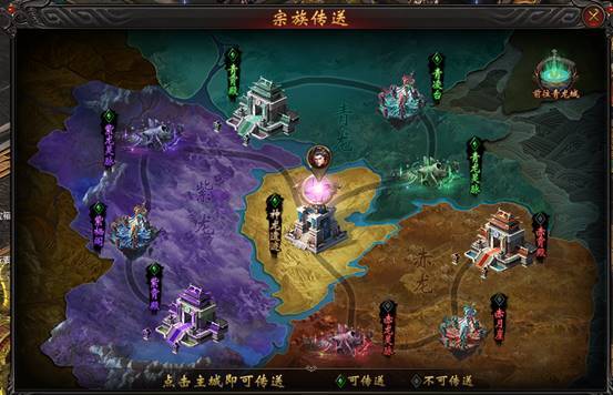 宗族传送:玩家可以通过“传送石”,自由传送前往己方宗族与联盟宗族的主城(如图)
