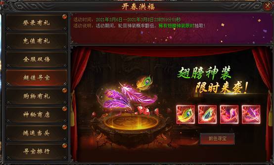 活动说明:活动期间,轮回神装概率翻倍,翅膀神装限时抽取!