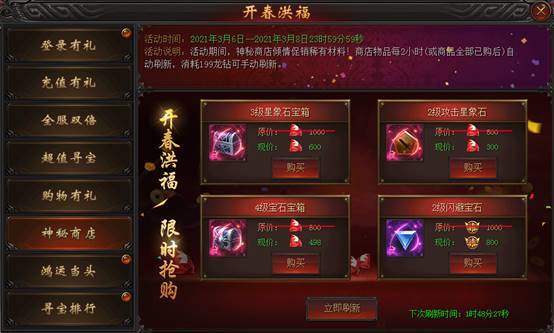 活动说明 : 活动期间,神秘商店倾情促销稀有材料!商店物品每2小时自动刷新(或全商品全部已购后),消耗199龙钻可手动刷新。