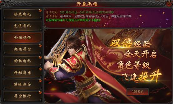 活动说明:活动期间,全服双倍经验活动全天开启,海量经验轻松得。双倍经验效果可与经验玉符和经验天书叠加!