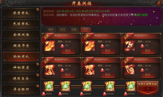 活动说明:活动期间,在活动界面购买特惠商品,消耗龙钻数量达到进度可获得额外奖励!