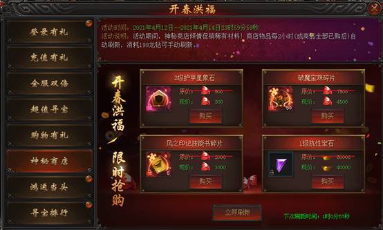 活动说明 : 活动期间,神秘商店倾情促销稀有材料!商店物品每2小时自动刷新(或全商品全部已购后),消耗199龙钻可手动刷新。