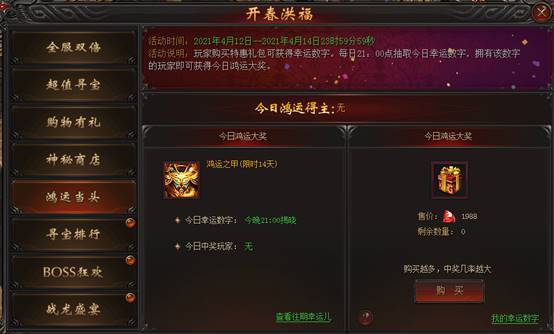 活动说明 : 玩家每消耗1988龙钻即可获得一个1-100之间的幸运数字。每日21点抽取今日幸运数字,拥有该数字的玩家即可获得今日鸿运大奖。