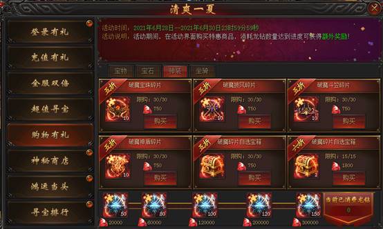 活动说明:活动期间,在活动界面购买特惠商品,消耗龙钻数量达到进度可获得额外奖励!