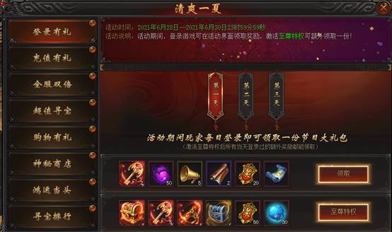 活动说明:活动期间,每日登录游戏可领取奖励,激活至尊特权可额外领取一份!