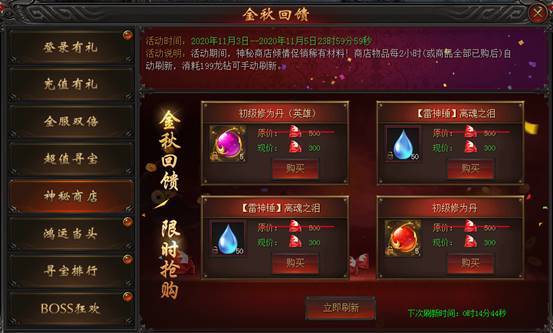 活动说明 : 活动期间,神秘商店倾情促销稀有材料!商店物品每2小时自动刷新(或全商品全部已购后),消耗199龙钻可手动刷新。